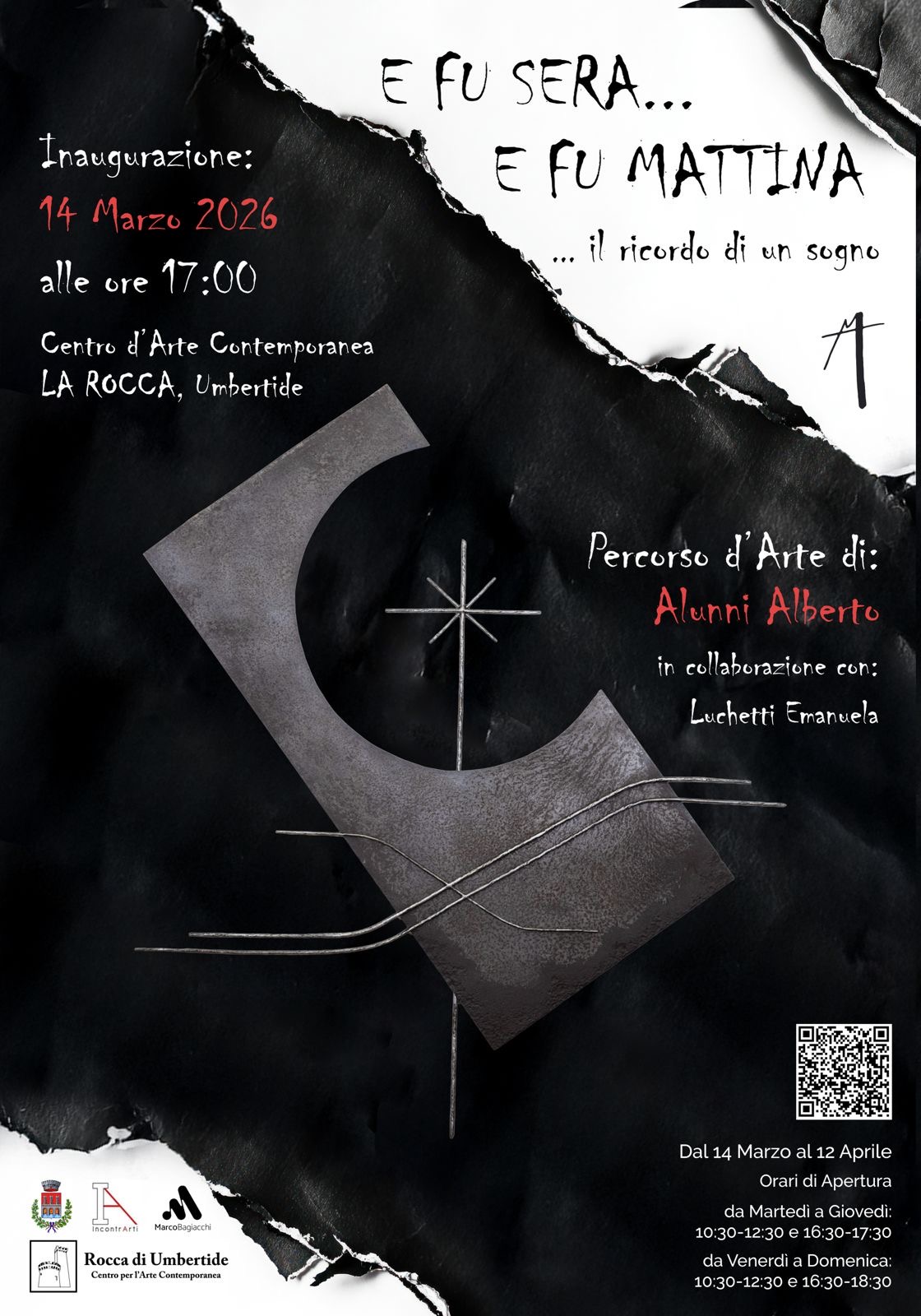 Un progetto espositivo che intreccia materia, spiritualità e visione artistica. È questo il cuore di “E fu sera e fu mattina… il ricordo di un sogno”, il percorso d’arte di Alberto ALUNNI realizzato in collaborazione con Emanuela Luchetti, ospitato, con il Patrocinio del Comune di Umbertide, negli spazi della Rocca – Centro per l’arte contemporanea dal 14 marzo al 12 aprile, con inaugurazione il 14 marzo alle 17.00 alla presenza dell’artista e degli organizzatori.